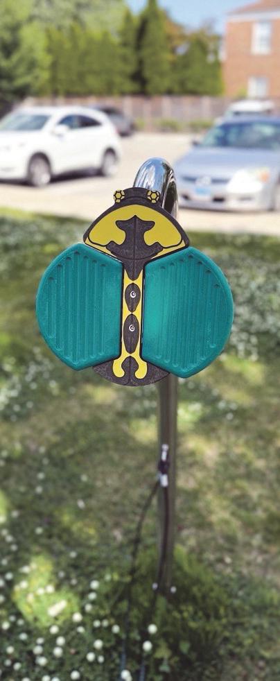 A new set of outdoor musical instruments is now available in Library Park, offering a fun and creative way for community members of all ages to engage in interactive play. The installation features percussive instruments shaped like a blue flower, a bee and a beetle.