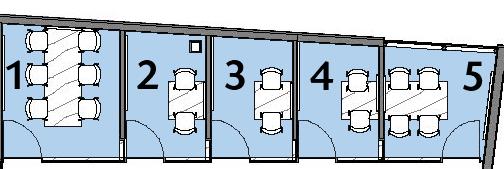 Study Room 1: Maximum seating for 6 people. Study Rooms 2, 3, and 4: Maximum seating for 2 people. Study Room 5: Maximum seating for 4 people.