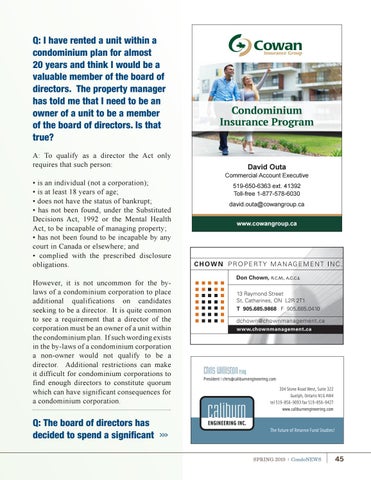 A: To qualify as a director the Act only requires that such person: • is an individual (not a corporation); • is at least 18 years of age; • does not have the status of bankrupt; • has not been found, under the Substituted Decisions Act, 1992 or the Mental Health Act, to be incapable of managing property; • has not been found to be incapable by any court in Canada or elsewhere; and • complied with the prescribed disclosure obligations. However, it is not uncommon for the bylaws of a condominium corporation to place additional qualifications on candidates seeking to be a director. It is quite common to see a requirement that a director of the corporation must be an owner of a unit within the condominium plan. If such wording exists in the by-laws of a condominium corporation a non-owner would not qualify to be a director. Additional restrictions can make it difficult for condominium corporations to find enough directors to constitute quorum which can have significant consequences for a condominium corporation.