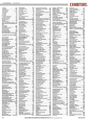 Choronga Safaris/Tri-State Outfitters……… 2216 Chris Bilkey Track & Trail Safaris…… 2005 Christensen Arms……………………… 4426 Christopher Smith Galleries……………… 2100 Cinnamon Creek Wild Game Processing/Ranch…V24 Circle M Outfitters……………………… 2338 Circle P Pogue Ranch……………………216 Citadel Deerstands…………………… 1507 CK Worldwide……………………………… 837 Classic Shine…………………………… BARS Classic Trophy Rooms & Classic Adventures… 2457 Clint Orms Engravers & Silversmiths… 3551 Coastal Alaska Adventures………………… 363 Coastal Conservation Association - Texas…… A4 Coastal Inlet Adventures………………… 1239 Coastal Plains Outdoors………………… 1424 Coenraad Vermaak Safaris…………… 3212 Colby Gines’ Wilderness Adventures……… 1225 Colletts Wildlife Artistry………………… 4336 Colorado Barrel Designs………………… 1113 Colorado Hunting Expeditions……… 2548 Colorado Outfitters, LLC…………………… 244 Come-2-Africa/Schalk Pienaar…………… 1420 Comre Safaris…………………………… 1926 Connecticut Shotgun Manufacturing Co.…… 4126 Conroe Taxidermy…………………… 1707 Conservation Incorporated……………… 1344 Convergent Hunting Solutions……………… 263 Coppersmith Global Logistics…………… 3102 Core-Vens Insurance…………………… 4517 Cotton Mesa Trophy Whitetail……… 3323 Cottonwood Armory……………………… 4146 Covey Rise……………………………… 1040 Craig Boddington.com…………………… 2012 Crocodile Bay Resort, Costa Rica…… 3029 Crusader Safaris……………………… 1922 Custom Stocks and Steel…………… ACGG Hall F Cycle Town South………………………… 1024 Cylinder & Slide Inc.………………… 4326 Cyndy Love Designs-Aspen……………… 1210 Cynthie’s Wildlife Originals………… 2310 Daggaboy Hunting Safaris……………… 2010 Daggaboy Safaris South Africa……… 1141 Dakota Arms…………………………… 4029 Dakota Outfitters LLC………………… 2741 Dallas Woods & Waters…………………… A28 Danny McCallum Safaris Ltd.…………… 2223 Dark Continent Video Productions………… 1903 Dark Horse Arms/Johns Guns……………… 4143 Darren K. Moore Custom Jeweler…………… 714 David Denies Bird Hunting…………… 2222 David Green Master Furrier………… 2715 David Mathews Outfitters………………… 1335 Day One Camouflage………………… 1324 D-Bar Whitetails…………………………… 217 de Boulle Diamond & Jewelry, Inc.………… 4440 De Klerk Safaris………………………… V1 Decot Hy-Wyd Sport Glasses……………… 1621 Deltana Outfitters, Inc.…………………… 2745 Deneki Outdoors………………………… 1504 Dennards Western Wear………………… 1107 Desert Steel……………………………… 825 DesFountain Safaris…………………… 2619 Detail Company Adventures………… 3657 Deuling Stone Outfitters Ltd.……………… 1332 Devin Rowe Bronze Inc.………………… 2545 Diamond Connection……………………… 435 Diamond Outfitters of Arizona…………… 4256 Diamond WIngs Lodge……………………… 218 DiamondBlade/Knives of Alaska…… 1262 Dirk de Bod Safaris Namibia CC………… 2211 Donnie Stegemoller Real Estate……………… 516 Double Diamond Outfitters……………… 4608 Double Guns of Nashville………………… 4356 Dove Island Lodge……………………… 3357 Dox Outdoors…………………………… 1412 Dries van Coller Safaris…………………… 310 Driftwood Valley Outfitters Ltd.……… 4232 Droptine Ranch…………………………… 507 DSC Austin Chapter………………………… A32 DSC Chapter Information…………………… A32 DSC Charleston Safari Club Chapter………… A32 DSC Foundation…………………………… A31 DSC Heartland Chapter…………………… A32 DSC Lubbock/Lubbock Sportsmans Club……… A32 DSC New Mexico Chapter…………………… A31 DSC Northeast, Inc.……………………A31 DSC Permian Basin Chapter (Midland)……… A32 DSC Press Room…………………… C4 Ballroom DSC Publications…………………………… P1 DSC South Texas Chapter…………………… A31 Dubarry of Ireland…………………… 3754 Duke Safaris……………………………… 812 Dumukwa Safaris……………………… 4060 Dzombo Hunting Safaris Namibia…… 2250 E.A.R. Inc.…………………………… 1620 EAI Outdoors………………………… 2428 EarthRoamer………………………… 1403 Electronic Shooters Protection……… 1815 Eleven11…………………………………343 Elizabeth & The Gold Lady…………… 1608 Elk Island Lodge…………………………… 917 Elk Quest……………………………… 2229 Ermilio Clothier & Specialty Shop Ltd.…3721