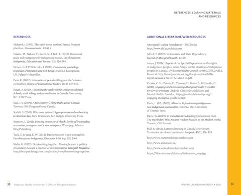 Anaya, J. (2014). Report of the Special Rapporteur on the rights of indigenous peoples, James Anaya, on the situation of indigenous peoples in Canada. UN Human Rights Council. A/HRC/27/52/Add.2. Found at: http://unsr.jamesanaya.org/docs/countries/2014report-canada-a-hrc-27-52-add-2-en.pdf. Crooks, C. V., Chiodo, D., Thomas, D., Burns, S., & Camillo, C. (2010). Engaging And Empowering Aboriginal Youth: A Toolkit For Service Providers (2nd ed). Centre for Addictions and Mental Health. Found at: https://youthrelationships.org/ engaging-aboriginal-youth-toolkit. Davis, L. (Ed.) (2010). Alliances: Re/envisioning Indigenousnon-Indigenous relationships. Toronto, On.: University of Toronto Press. Davis, W. (2009). In Canadian Broadcasting Corporation (Ed.), The Wayfinders: Why Ancient Wisdom Matters in the Modern World. Toronto, ON: Anansi. Hall, R. (2012). Diamond mining in Canada’s Northwest Territories: A colonial continuity. Antipode, 45(2), 376-393. http://www.metroproblems.tumbler.com http://www.sixnations.ca/ http://www.we’reallmixedup.tumbler.com https://files.ontario.ca/pictures/firstnations_map.jpg