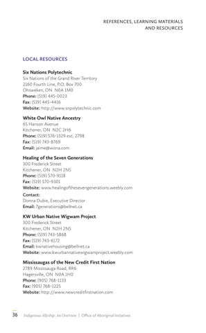 LOCAL RESOURCES Six Nations Polytechnic Six Nations of the Grand River Territory 2160 Fourth Line, P.O. Box 700 Ohsweken, ON N0A 1M0 Phone: (519) 445-0023 Fax: (519) 445-4416 Website: http://www.snpolytechnic.com