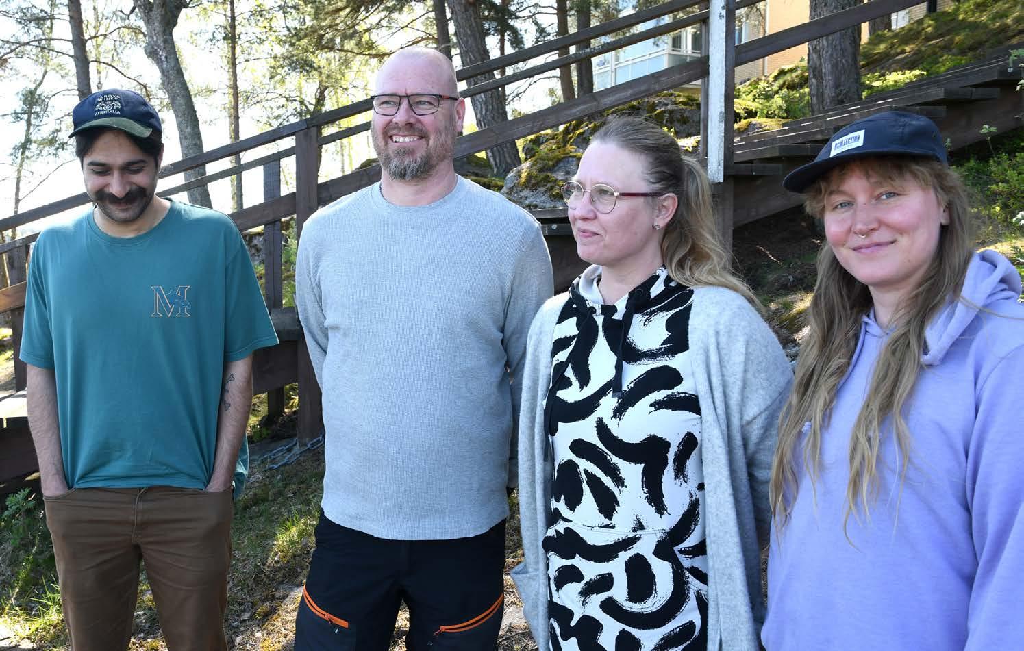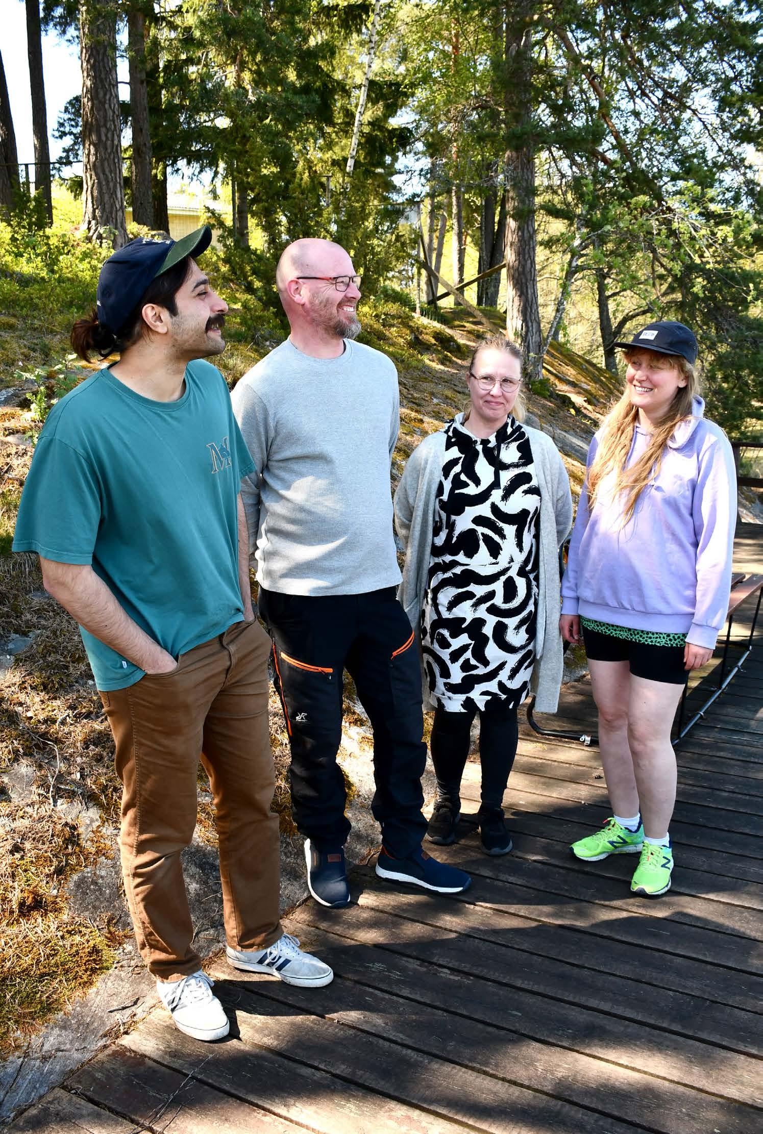 Firat Altin (vas.), Jukka Silvennoinen, Sarianne Silvennoinen ja Maiju Karhu osallistuivat keväällä Kelan rahoittamalle ja Lounais-Suomen Syöpäyhdistyksen järjestämälle syöpäkurssille Meri-Karinan hyvinvointikeskuksessa. Lue kurssista kertova juttu sivuilta 14–15. Kuva: Ville Remes