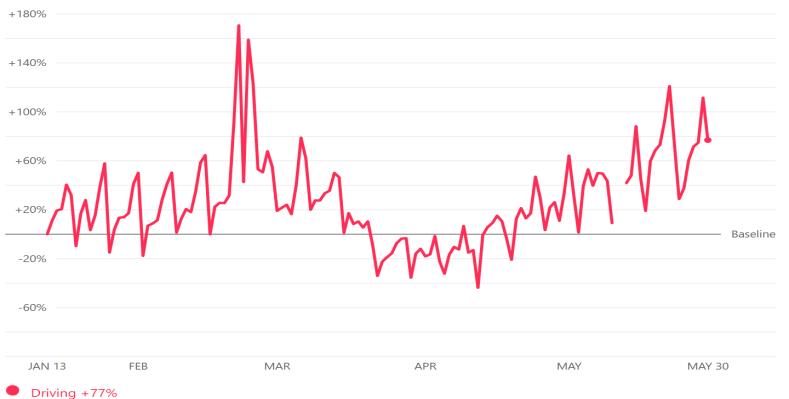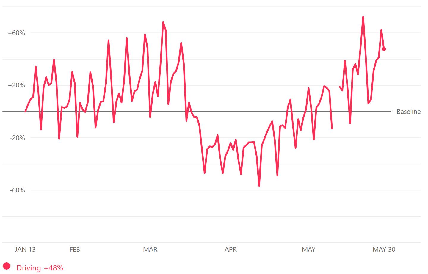 Apple’s Mobility Trends Report tracks aggregate changes in mobility from January 13 to May 30, 2020.