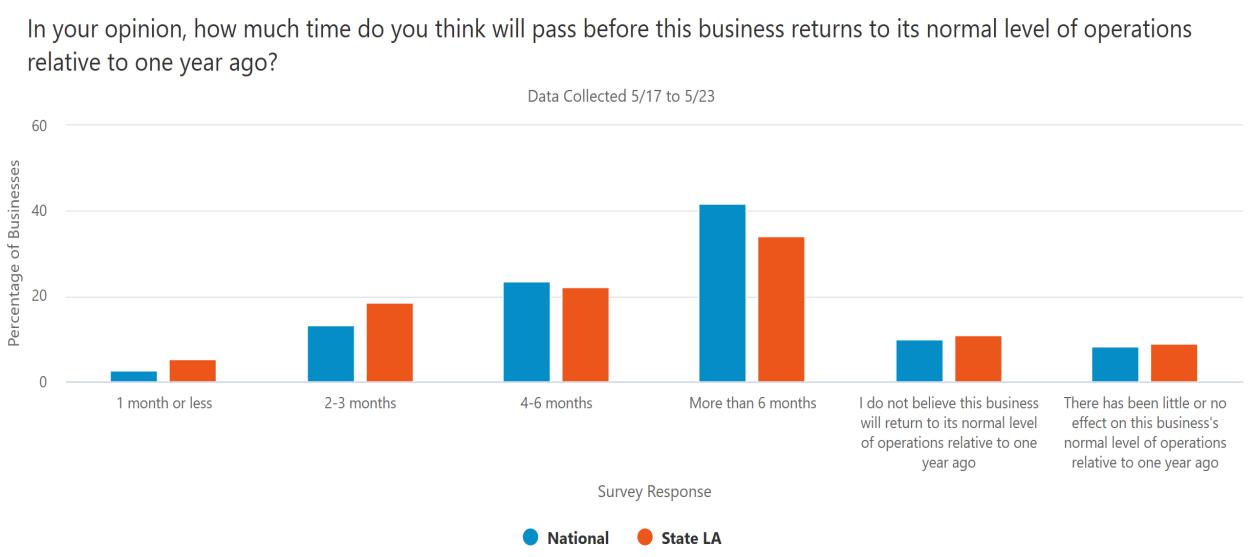 In April, the US Census initiated a survey to track the pulse of small businesses during the COVID-19 pandemic. Results for the May 17 – May 23 period in Louisiana are shown on the right.