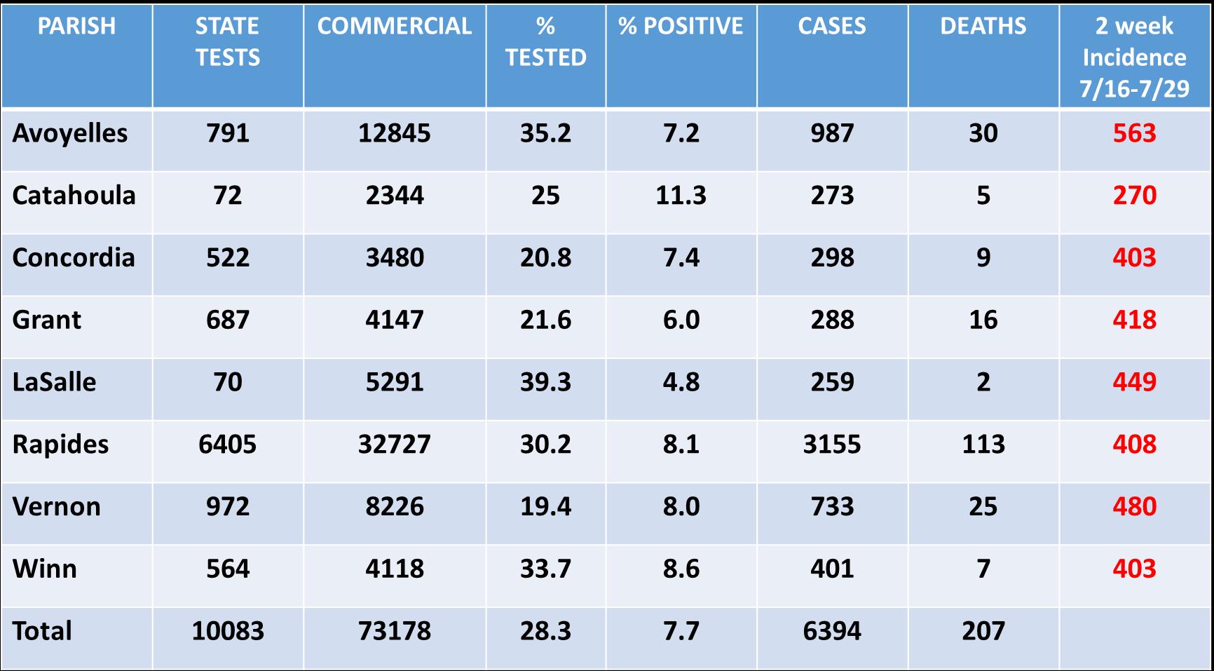 Source: Louisiana Office of Public Health, Region 6 (Central Louisiana), Regional Administrator/Medical Director, David J. Holcombe, MD, MSA,August 7, 2020.