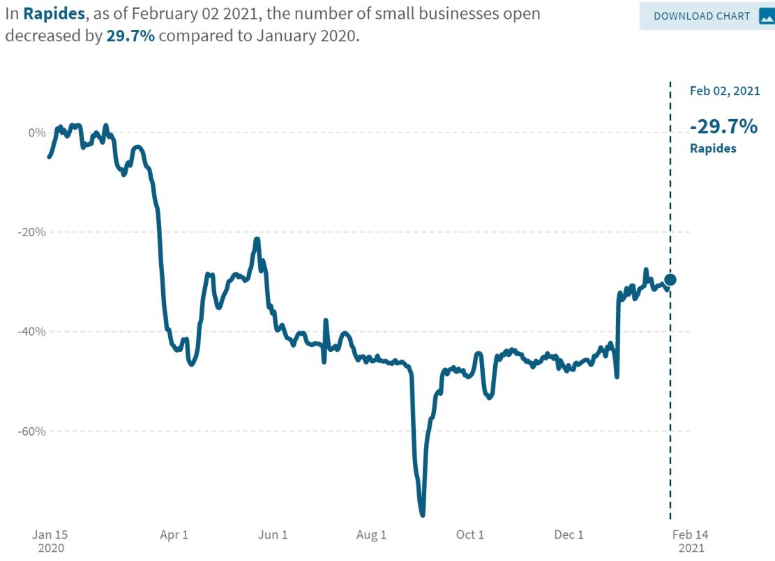 The chart below represents the percent change in the number of small businesses open in Louisiana and Rapides as of February 2, 2021 with January 2020 as the baseline.