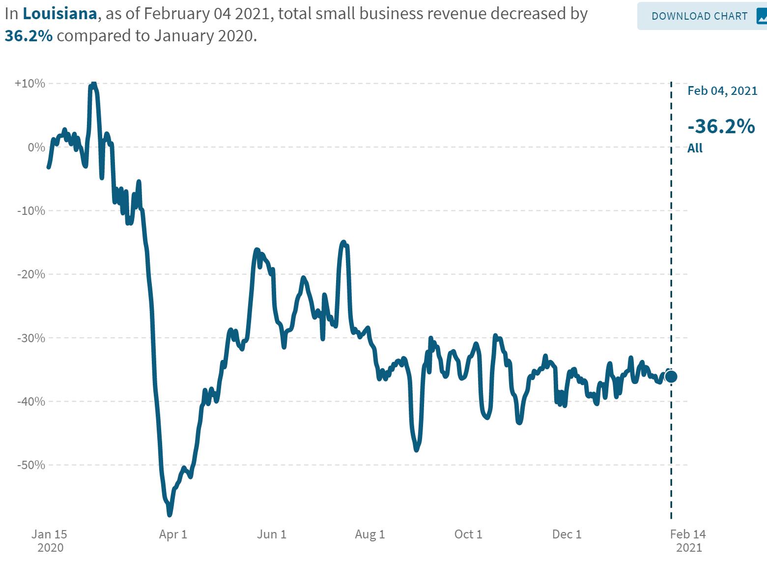 • Small business revenue in Louisiana was down 36% in late January compared to January 2020 with leisure and hospitality small business revenue down 71%.