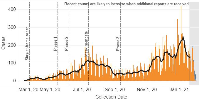 COVID-19 cases by collection date as of February 3, 2021 in Region 6 with a 7day moving average.