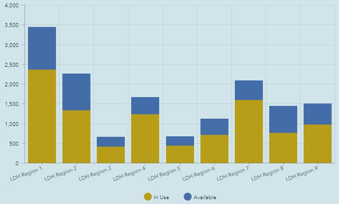 Available beds by Louisiana Department of Health region as of February 3, 2021. Source: Louisiana Office of Public Health, Region 6 (Central Louisiana), Regional Administrator/Medical Director, David J. Holcombe, MD, MSA, February 4, 2021. :
