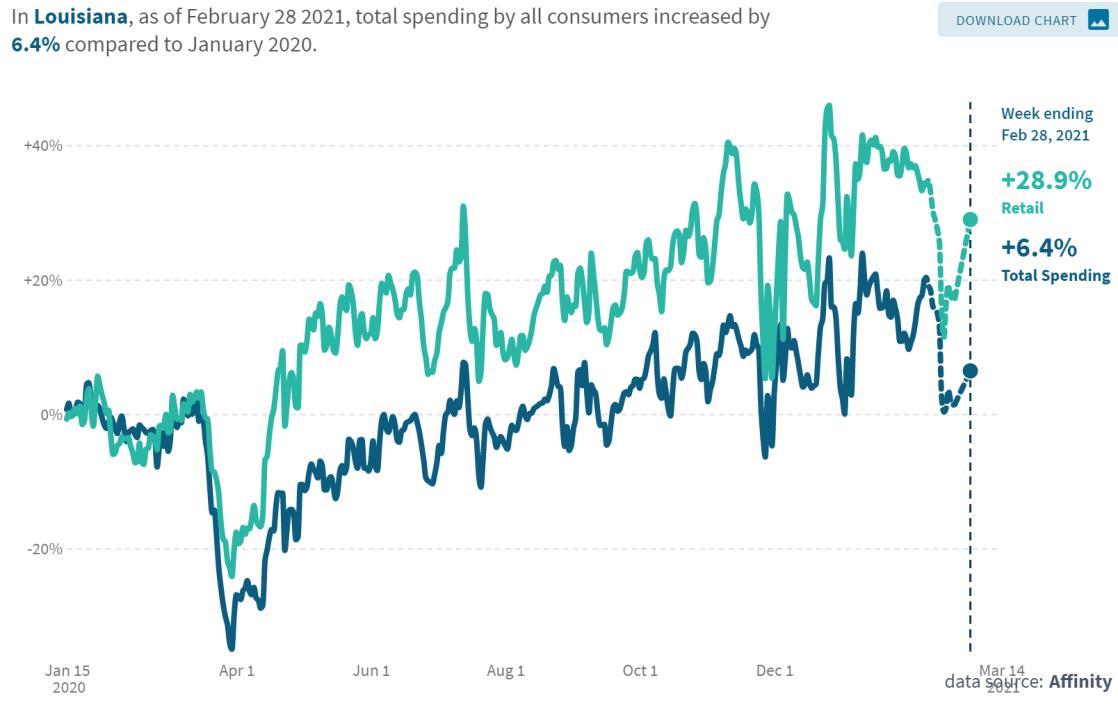 • Total consumer spending in Louisiana is up 6.4% compared to January 2020, with retail spending up 29%. Entertainment and recreation spending is down 40%.