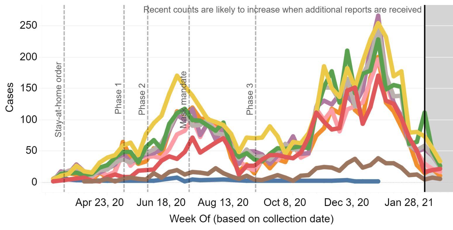 Cases over time by age group in Region 6 through March 8, 2021.