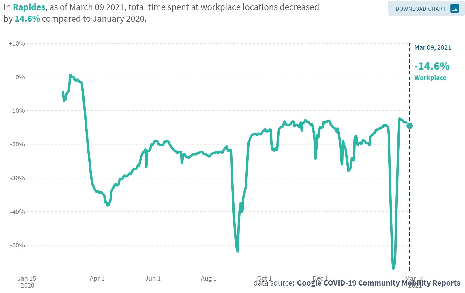 The chart represents the percent of time employees in Rapides Parish spent at work as of March 9, 2021 with January 2020 as the baseline. The table provides comparable data for other central Louisiana parishes.