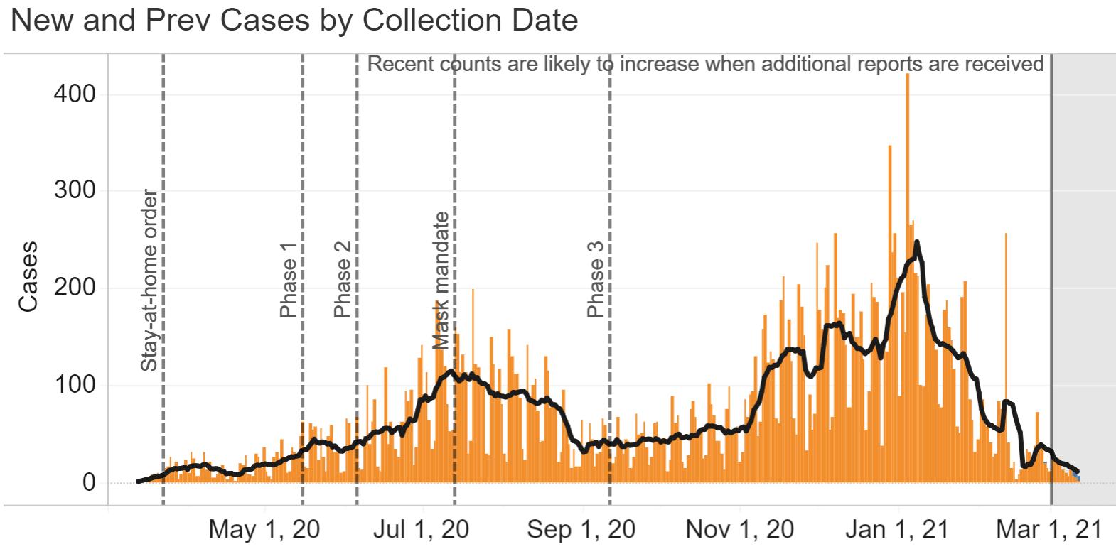 COVID-19 cases by collection date as of March 12, 2021 in Region 6 with a 7-day moving average.