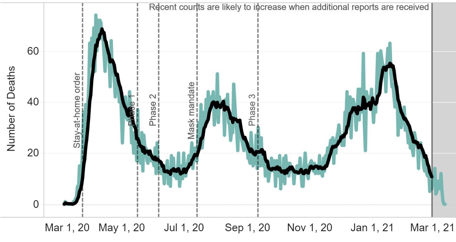 COVID-19 deaths by date of death statewide as of March 12, 2021.