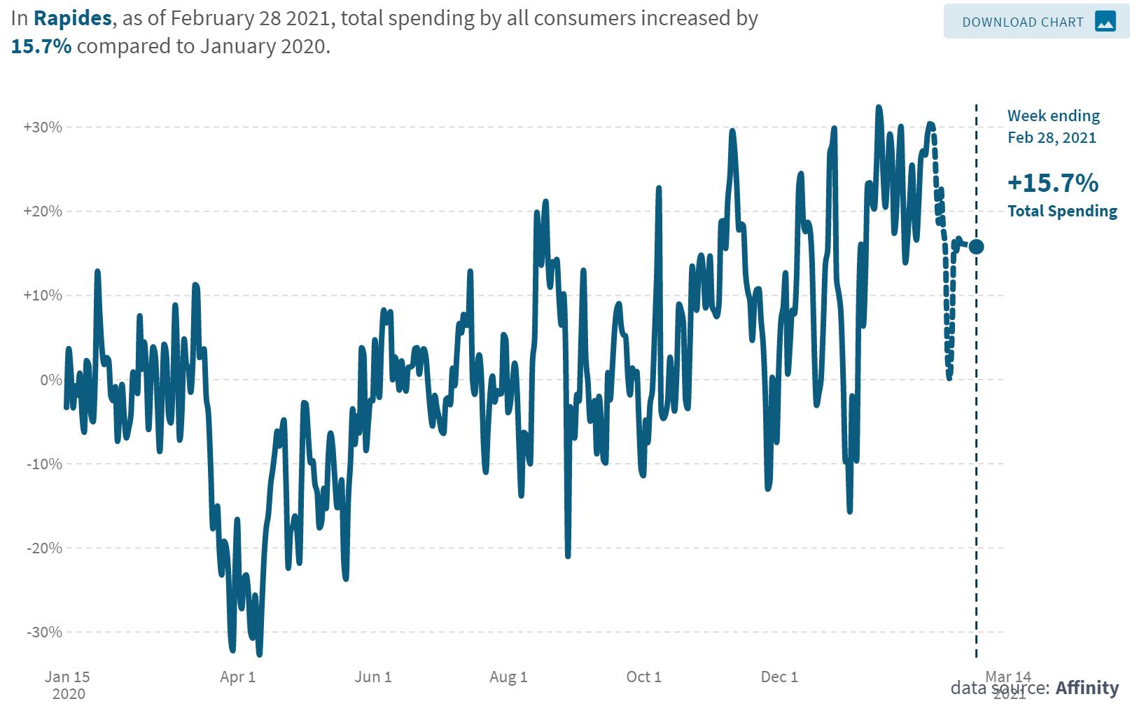 The table and chart represents the percent change in average consumer credit and debit card spending in Cenla as of February 28, 2021 with January 2020 as the baseline, while the chart represents Rapides.
