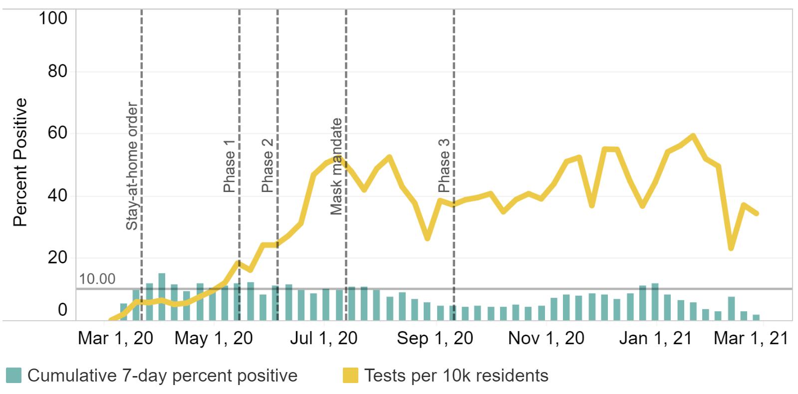 COVID-19 percent positive and test volume in Region 6 as of March 12, 2021.