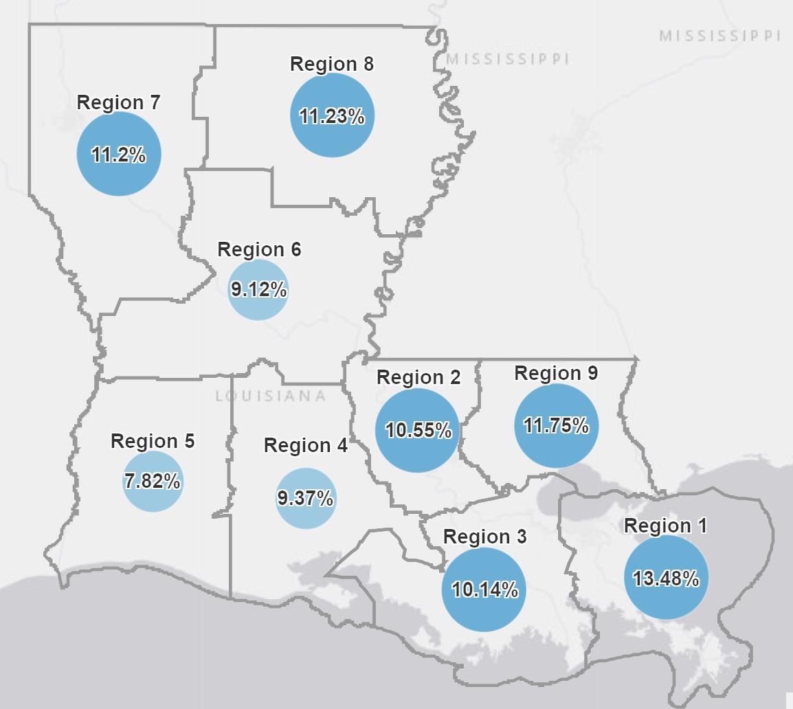 • 9.1% of the population in Region 6 (Cenla) have completed vaccination. Rapides and Natchitoches have the highest percentage of completed vaccinations in Region 6 at 11%.