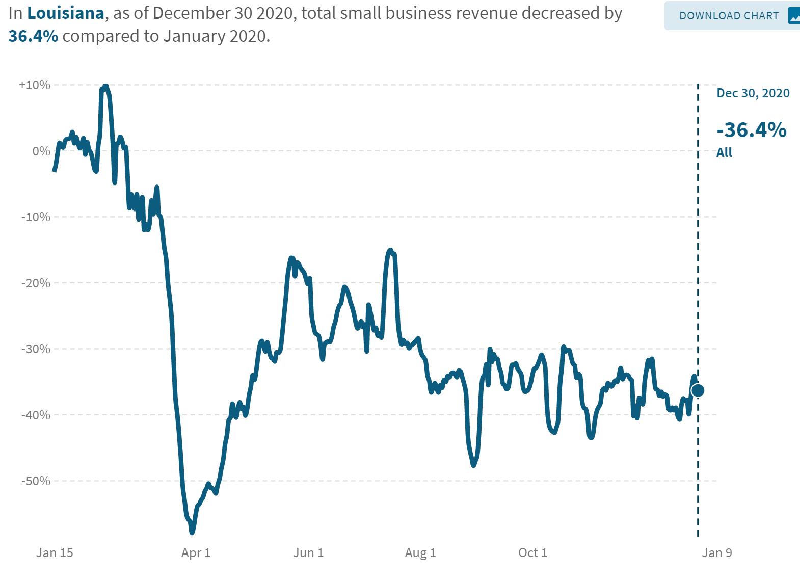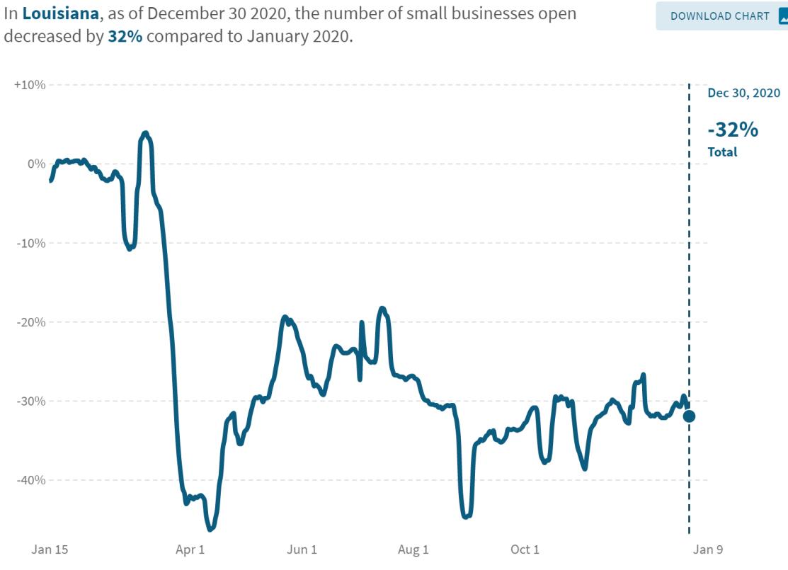 • Small business revenue in Louisiana was down 36% in late December compared to January 2020 with leisure and hospitality small business revenue down 68%.