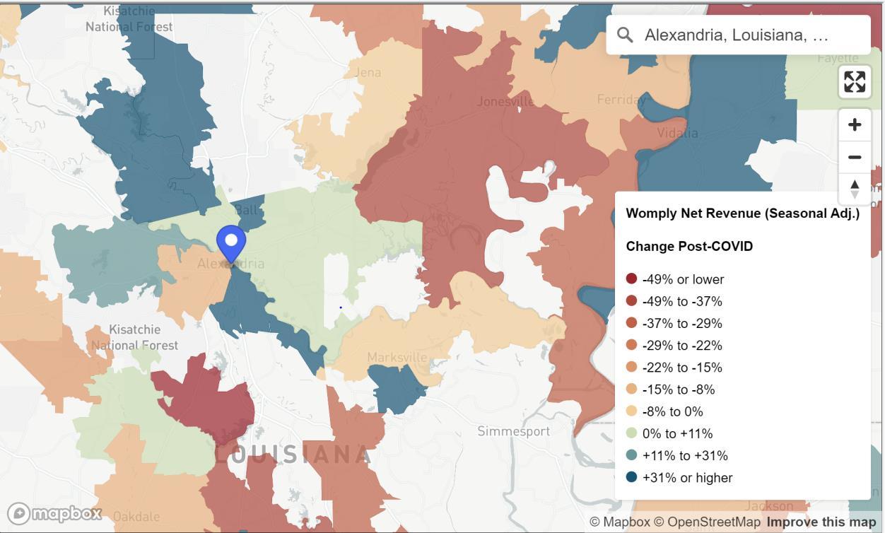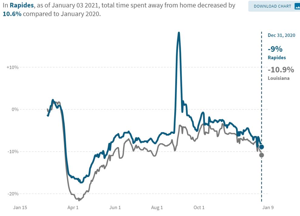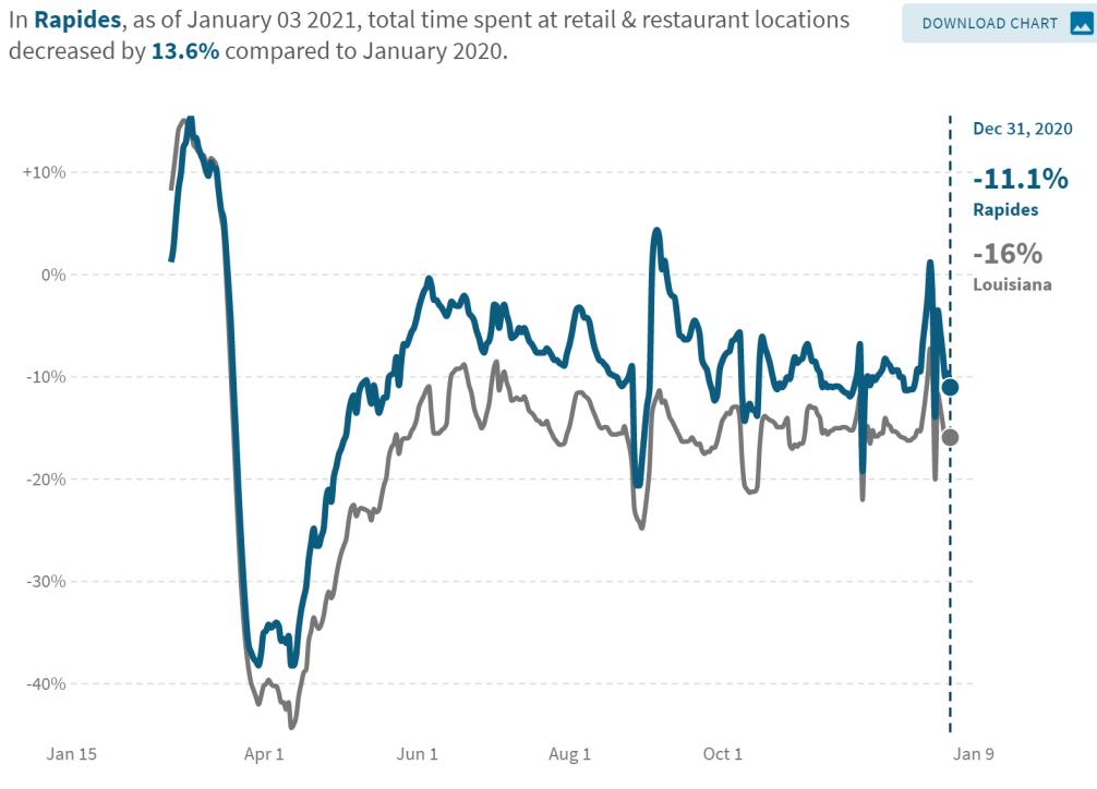 • Using data from financial transactions, Opportunity Insights reports consumer spending in Rapides the first week of December was up 4.1% compared to January 2020 while statewide spending was up 11%.