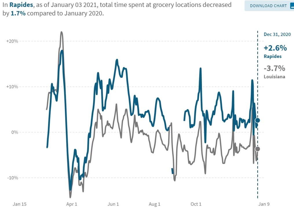 The charts represent the percent of time spent at retail / restaurant and grocery locations in Rapides Parish compared with the state as of December 31, 2020 with January 2020 as the baseline.