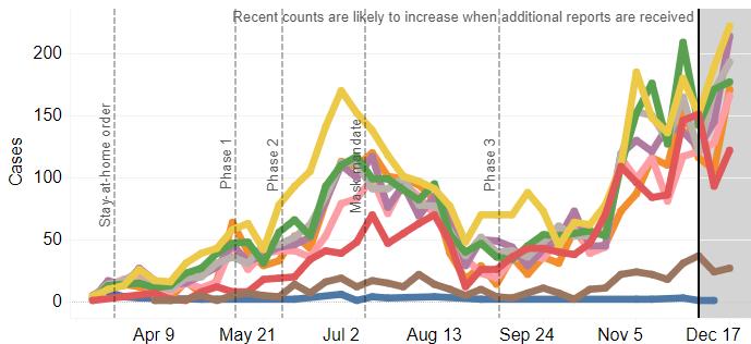 Cases over time by age group in Region 6 through January 7, 2021.