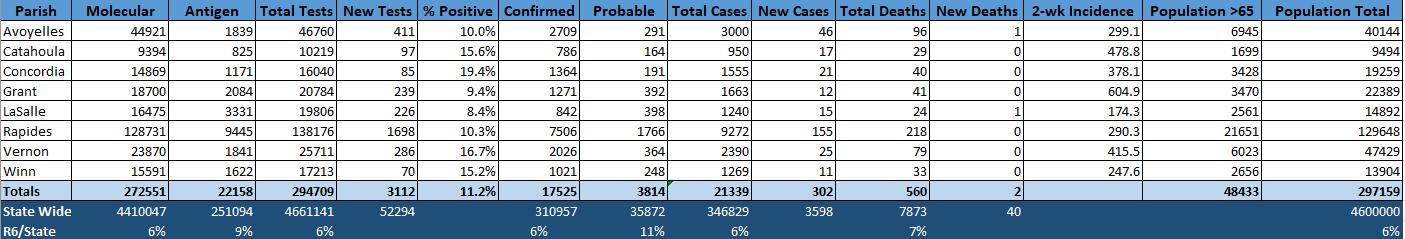 Source: Louisiana Office of Public Health, Region 6 (Central Louisiana), Regional Administrator/Medical Director, David J. Holcombe, MD, MSA, January 7, 2021.