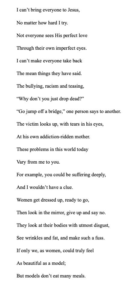 Every day after I helped Mom move, I would go out to the creek, imagining I’d find some sort of bridge to Terebithia or wardrobe portal. But the creek stared at me, murmuring its nonsense language, wondering why I couldn’t understand. So, when Sam appeared at the other end of the creek one day, I blinked as if he were a figment of my farfetched hopes and he would disappear when my eyes opened. But he was still there, waving briefly, a small grin enhancing his features.