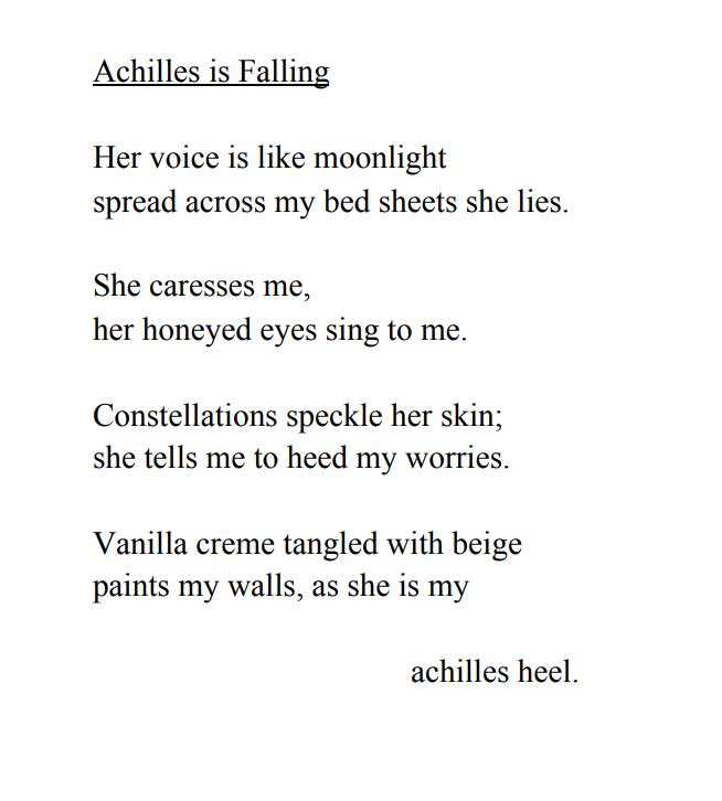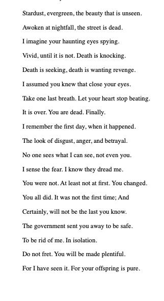 I got lost in my thoughts of my mother when something strange happened. I looked up at the sky to see the moon shining brightly, casting a glowing light over the glimmering water, when suddenly I noticed something falling from the sky. A small drop of what I thought to be rain, hit my thigh, but I quickly found out it was not water at all. The drop gently hit my leg as it dissipated on my skin. The strange thing about this drop was that it looked like water but had the same glowing hue as the moon. Glowing rain, what could this mean? I soon realized that it wasn't raining at all. I looked back up at the sky to discover that it was only that single drop of glowing mystery that landed on me.