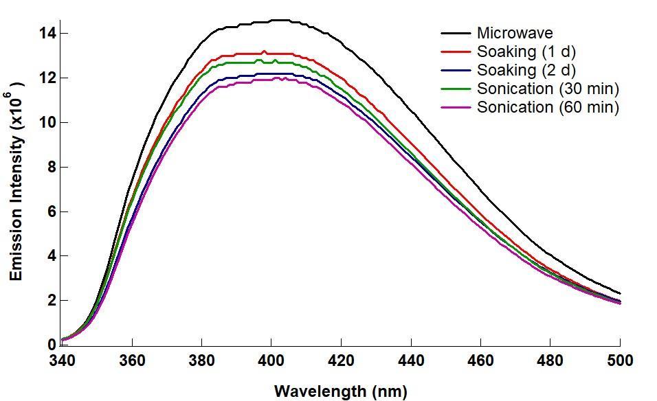 The results from absorbance, however, did not translate to the same trend in fluorescence. Using an excitation wavelength of 290 nm (Figure 3), the extract from the microwave showed the lowest emission intensity. Soaking for two days exhibited the highest intensity, followed by sonication for60 min.Statisticalanalysisshoweda significantdifferenceamongall extractsexcept for the ones obtained from sonication and soaking at a shorter period. On the other hand, for excitation at 330 nm, the microwave extraction yield extracts with the highest intensity followed