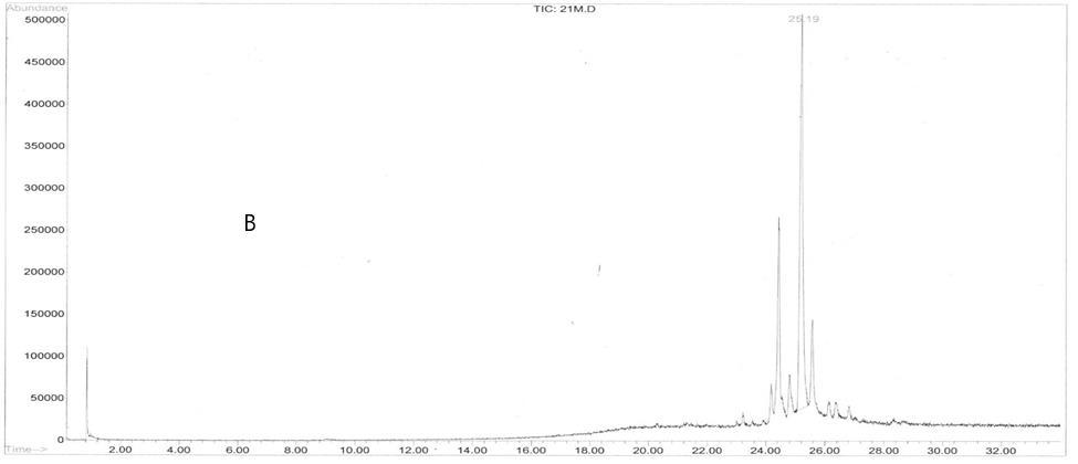 A 5 µL pure extract was used in each scan. A Hewlett-Packard gas chromatograph 6890 series linked to a Hewlett-Packard 5973 mass selective detector with 30 µm x 250 µm x 0.28 µm HP5-MS column was used for GC-MS analysis. The total analysis run is 36 minutes long. With