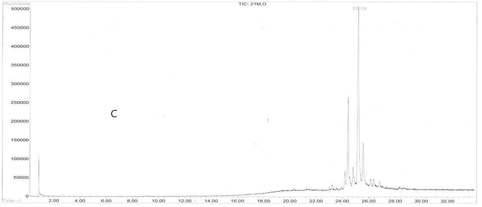 Figure 4. Total ion chromatogram of propolis extracts obtained using A) microwave extraction, B) ultrasonication at 60 mins, and C) soaking for two days.