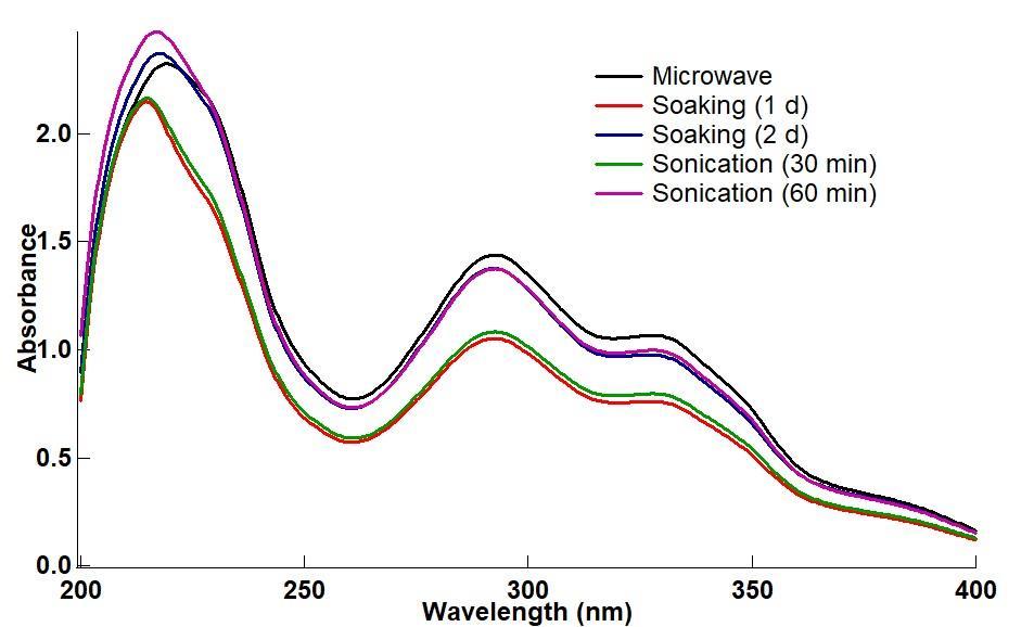 Extract from the microwave method has the highest absorbance based on the peak at 290 nm, and at 330 nm region followed both by sonication for 60 min and soaking for two days. Soaking propolis samples for one day has the lowest absorbance at the two peak regions, followed by sonication for 30 min. Statistical analysis showed that the absorbance obtained from the microwave extract is significantly different from the other extracts. It was also determined that there are no significant differences in absorbance for extracts from both sonication and soaking. Absorbance results confirmed that the longer the extraction time, the more materials that can be extracted. Both soaking and sonication yield higher absorbance at a longer period, significantly different from those obtained at a shorter period.