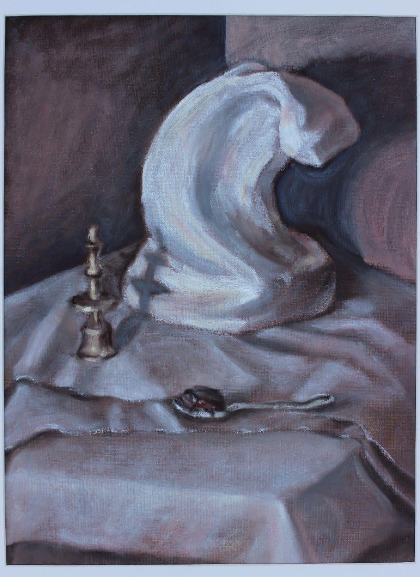 Its painting is maroon, purple, and scarlet, blurry and messy from a brush that was not involved enough to feel my guilt.