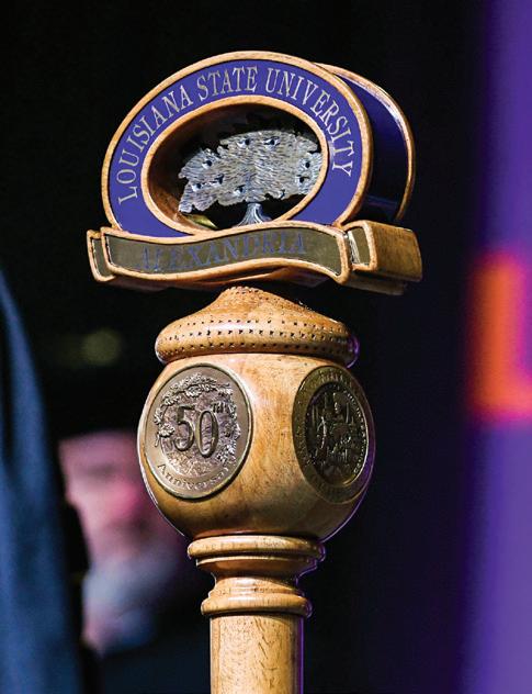 A mace is the traditional university symbol of educational authority and institutional identity and is presented at formal university rituals and traditions, such as commencement ceremonies. The LSUA mace is forty-eight inches tall and weighs approximately ten pounds. It is crafted of wood from a fallen live oak tree native to the Louisiana State University of Alexandria campus and solid brass. The brass spacers that collectively form the shaft are engraved with milestone dates in the history of the university.