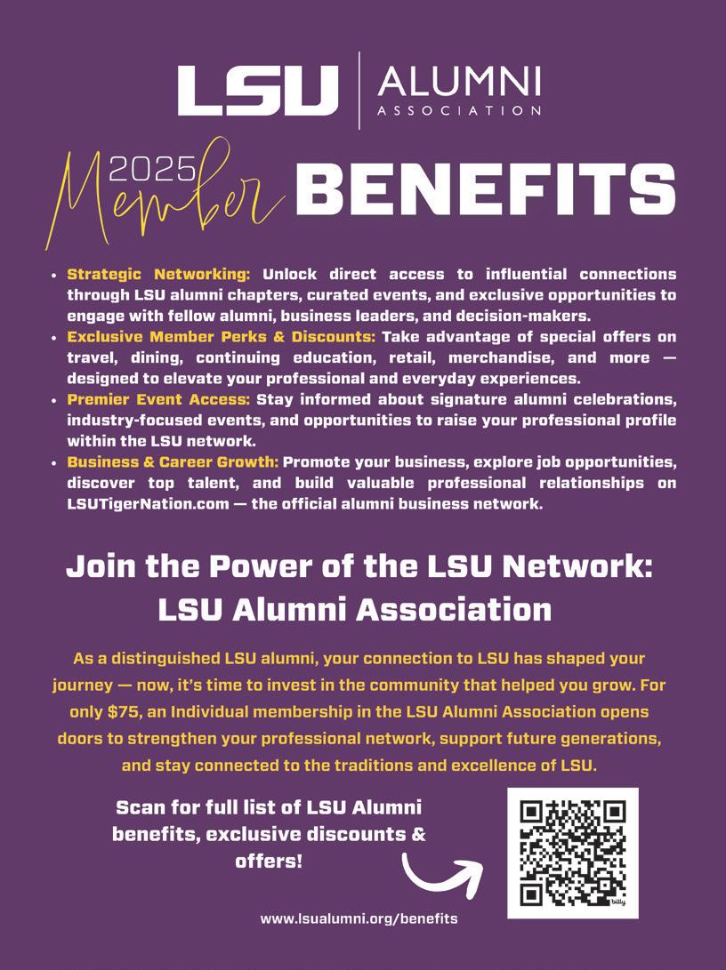 As we look forward to the holiday season and the conclusion of 2025, the LSU Alumni Association continues to connect Tigers with Tigers worldwide through many programs and events: Traveling Tigers, the Alumni Business Network, and Networking on the Geaux, just to mention a few. We invite you to join us by becoming a member and/or sponsor.