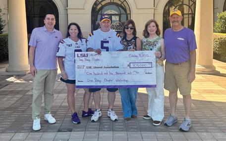 Members of the San Diego Alumni Chapter traveled to Baton Rouge to present a check for $105,000 to the Alumni Association for its scholarship fund. On hand to receive this generous donation were Joe Carvalhido, LSU Alumni Association president/CEO, and Amy Parrino, LSU Alumni Association senior vice president of scholarships and planned giving.