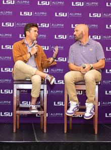 A trio of former football players – Brad Wing, Russell Shepherd, and Todd McClure – joined sports radio host Hunt Palmer for a lively discussion at LSU Alumni Association’s Football Friday before the LSU vs. the University of South Carolina game. Other guests included Verge Ausberry, LSU athletic director, recruiting expert Shea Dixon, and sports talk show host Matt Moscona and Gordy Rush from Guaranty Media.