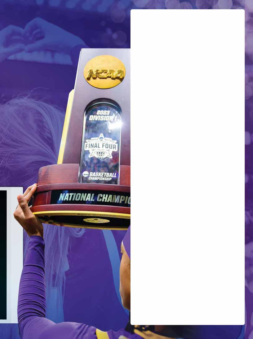 Hearty cheers and congratulations to our 2023 national champions – Kim Mulkey’s women’s basketball team and Jay Johnson’s baseball Tigers. What an exciting spring season for LSU fans everywhere! Flip to page 20 to read about Johnson’s win and enjoy a highlight recap of Mulkey’s record-setting run, which appeared in the Summer 2023 magazine.