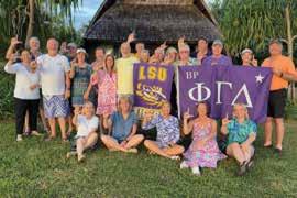 Eleven LSU Phi Gamma Delta members – ranging in age from 63 to 71 – and their wives flew from six U.S. states to Fiji for a reunion week filled with daytime excursions, evening Happy Hours and, of course, plenty of reminiscing. The group swapped stories about how they would transform 21 Fraternity Lane each April into a tropical island, bringing in truckloads of sand to create beaches