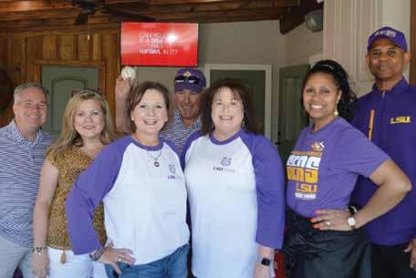 Proudly showing their LSU colors are, from left, seated, Nancy Mayeux Baldridge, Cindy Cary Bacon, Katherine “Kat” Jensen Boccaccio, Delores Bonin and Shannon Latchem; standing, Lisa Phenice Stevens, David Stevens, Bob Boccaccio, David Hanna, Evelyn Hanna, Dr. David Sicard, Karen Clement Sicard, Bruce Bacon, Robert Baldridge, Sharon Robinson, Ken Robinson, Linda Thrasher Mundinger, Joseph “Joey” Bonin, Jr., John Mundinger, Dr. Don Mizelle, Cindy Mizelle, and Ray Latchem.