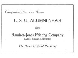 You’ll enjoy this year’s first issue, which includes coverage of the Annual Meeting & Past Presidents Luncheon, the Scholars Banquet, and more. A particularly delightful piece in is a “look back” at ads that appeared in the magazine’s “ancestors,” beginning with The Louisiana State University Alumni News Vol. 1 No. 1 (1924).