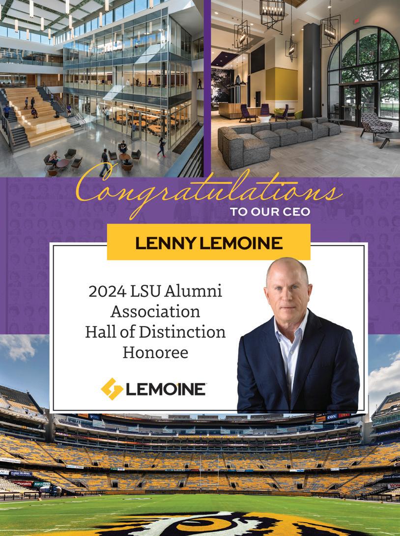 On the cover: LSU Alumni Association’s 2024 Hall of Distinction inductees include Dr. William Brookshire (honored posthumously), Alumnus of the Year; Seimone Augustus, Young Alumna of the Year; Beth Courtney; Lane Grigsby; Matt and Melissa Juneau; Lenny Lemoine; Anthony “Booger” McFarland; and Dr. Jyric Sims.
