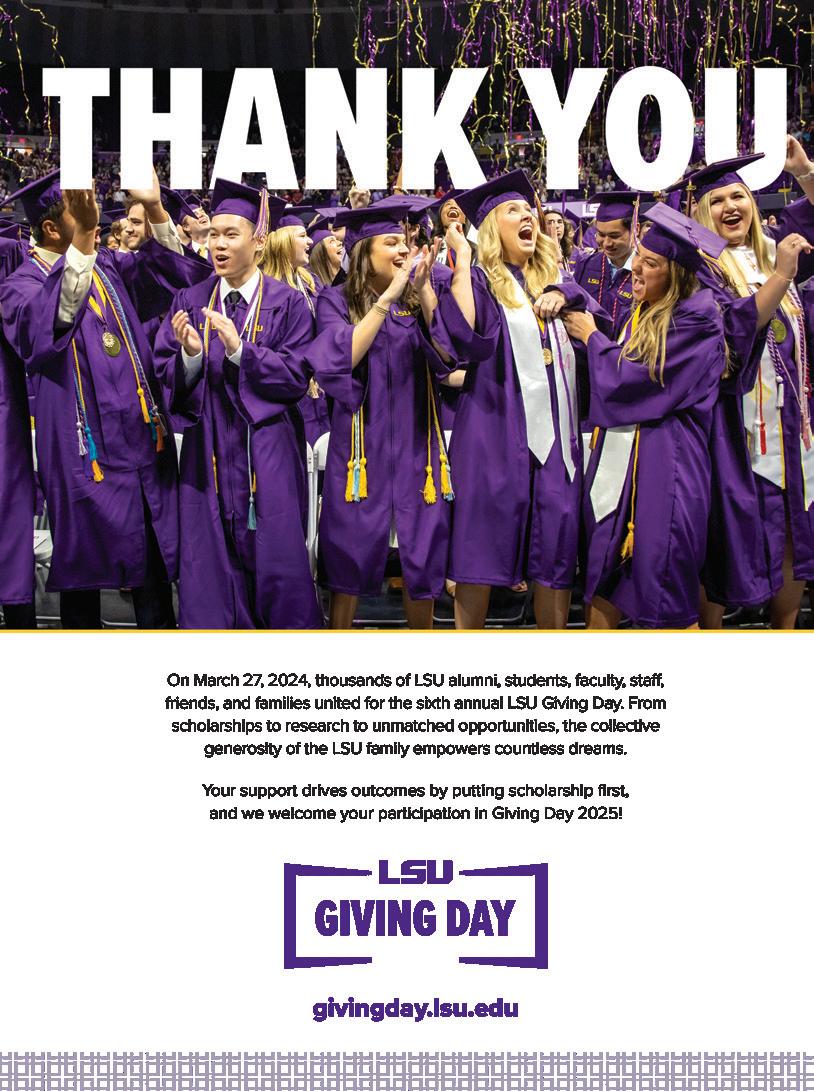 In just a few weeks, we’ll celebrate yet another stellar graduating class as they make the transition from student to alum, joining your esteemed ranks. They represent the promise and potential our university instills in everyone who spent time beneath our campus’ famous oaks and arches in pursuit of an education that delivers a lifelong return on investment. Our job is to celebrate their milestone, support them as they enter the workforce, and welcome them into the LSU family of alumni, so that we can all watch as they become the leaders of tomorrow.
