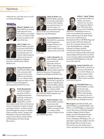 John C. Anjier (1984 BACH H&SS, 1990 JD), an attorney with Liskow & Lewis, New Orleans, was named to the 2017 edition of Best Lawyers in America in the areas of Commercial Litigation, LitigationSecurities, and Securities-Capital Markets Law. George Arceneaux III (1983 BACH H&SS, 1986 JD), an attorney with Liskow & Lewis, New Orleans, was named to the 2017 edition of Best Lawyers in America in the areas of Commercial LitigationEnvironmental and Oil & Gas Law. Kinder Baumgardner (1987 BACH A&D), president of SWA, a leading international landscape architecture, planning, and urban design firm, received three major awards at the 2016 American Society of Landscape Architects annual meeting in October – an Honor AwardGeneral Design for a project in Ningbo, China; an Honor Award – Analysis and Planning for a Houston Parks Board project; and an Honor Award-Analysis and Planning for the Baton Rouge lakes project.