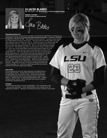 FRESHMAN SEASON (2011) Totaled 53 appearances, including 38 starts between second base (20), right field (12), centerfield (3) and shortstop (3) … LSU won 15 of 20 games when Blades started at second base … Turned in a .252 batting average (26-for-103) with five RBIs … Reached base in 26 of her 38 starts … Garnered a perfect fielding percentage fueled by 60 putouts and 25 assists … Was hit-by-pitch and notched a RBI in first career plate appearance versus Louisiana Tech (Feb. 11) … Scored first career run and added another RBI against Southern (Feb. 18) … Collected a career-best 3-for-3 performance with a career-high two runs scored versus Nicholls State (Feb. 19) … Went 2-for-2 with a RBI against McNeese State (Feb. 23) … Recorded hits against No. 3 Arizona (Feb. 25) and No. 14 California (Feb. 26) … Was 2-for-4 versus Hofstra (March 4) during Yvette Girouard’s 500th win at LSU … Came away with a career-high seven putouts to go along with two assists at No. 1 Georgia (March 11) … Picked up a RBI single as part of LSU’s seven-run third inning at Nicholls State (March 23) … Secured hits in nine of her last 12 games (April 22-May 20) sparked by a career-long seven-game hitting streak (April 22-May 1) … Her seven-game streak was tied for second-longest on the team in 2011 … Racked up a .429 hitting clip (9-for-21) and boosted her average by 53 points during the streak … Scored a run in five of those contests … Went 2-for-3 with a RBI at Ole Miss (April 23) … Tallied a 2-for-4 effort with a run scored at Mississippi State (April 30) … Posted hits and scored a run during final two games of the South Carolina series (May 7-8) … Was 0-for-2 against Syracuse (May 20) in her lone appearance at the NCAA College Station Regional. HIGH SCHOOL Four-year letterwinner for former Tigers April Janzen and Ashlee Ducote at Parkview Baptist School ... Notched NFCA All-America Second-Team and All-South Region First-Team honors in 2010 ... Earned a trio of All-District and All-State selections after her team finished as the 3A runner-up from 2008-10 ... Selected LSWA’s 3A Most Outstanding Player in 2010 ... Member of National Honors Society .. Recruited by Baylor and Louisiana-Lafayette ... Also lettered in basketball and track. PERSONAL Daughter of Jeanne Johnson, and Gene and Julie Blades ... Born on November 4, 1991 ... Has one sister, Bryndi (25) ... Cousin, Michele Williams, was a member of the LSU volleyball team (2008-11) ... Majoring in kinesiology with a human movement concentration.