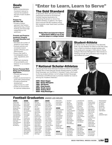 “Enter to Learn, Learn to Serve” The Gold Standard In December 2012, LSU was one of 45 institutions honored by the American Football Coaches Association for graduating 75 percent or more of its student-athletes. In addition, the Tigers have produced 134 SEC Academic Honor Roll recipients under head coach Les Miles since 2005.
