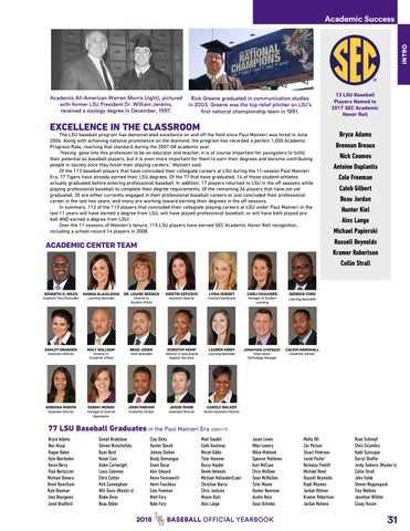 77 LSU Baseball Graduates in the Paul Mainieri Era (2007-17) Bryce Adams Ben Alsup Ragan Baker Kyle Beerbohm Kevin Berry Paul Bertuccini Michael Bonura Brent Bonvillain Kyle Bouman Joey Bourgeois Jared Bradford