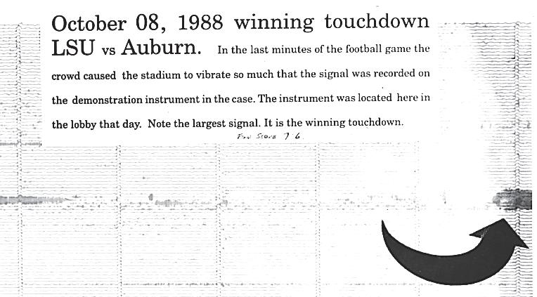 touchdown against Auburn, the explosion of the crowd was so thunderous that it caused an earth tremor that registered on a seismograph meter in LSU’s Geology Department across campus.