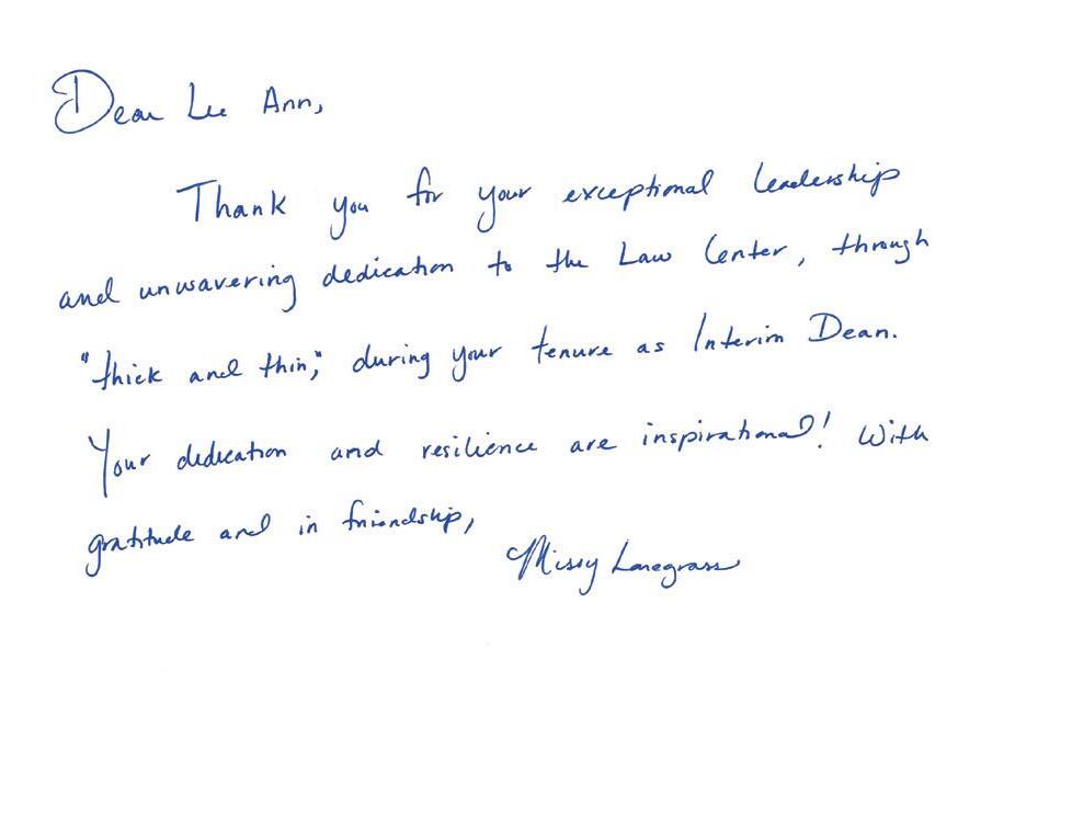 After completing her service as interim dean, Lockridge rejoined the LSU Law faculty, which she has been a member of since 2005. Some of her colleagues and friends share their messages of gratitude on the following page.